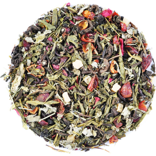 Zloženie: Sencha, čaj Pu-erh, šípková kôra, ibištek, kandizovaný ananás, baza, praslička roľná, artičokový list, mäta pieporná, aróma