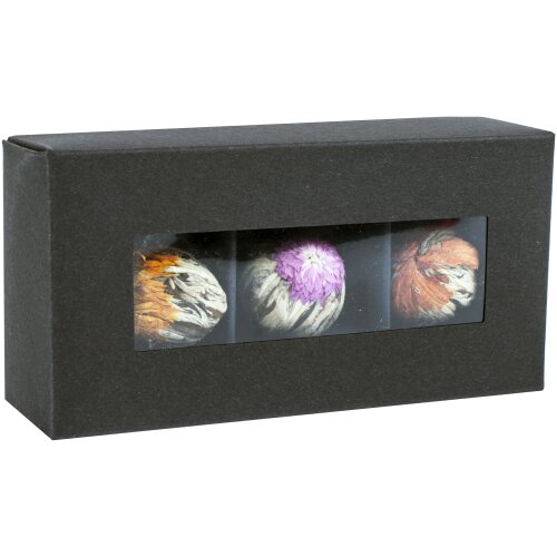 Krabička na čokoládu Blooming Chocolate Box v krásnej čiernej krabičke obsahuje tri kvitnúce čaje, ktoré vytvárajú výnimočne exkluzívnu kompozíciu. Pre dosiahnutie najlepších výsledkov by sa mali variť v priehľadnej kanvici s objemom približne 600 ml.