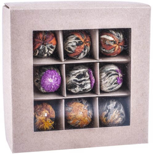 Kvitnúca škatuľka na čaj, umiestnená v krásnej remeselnej škatuľke, obsahuje deväť kvitnúcich čajov, čo vytvára výnimočne exkluzívnu zmes. Pre dosiahnutie najlepších výsledkov by sa mali variť v priehľadnej kanvici s objemom približne 600 ml.