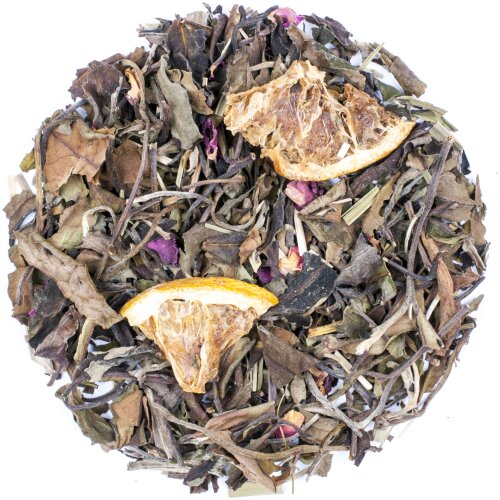 Pai Mu Tan, vzácny list bieleho čaju, je srdcom tejto zmesi. Jeho jemná a jemná chuť poskytuje dokonalé pozadie pre živšie ingrediencie. Sviežosť a mierna horkosť pomarančových štvrtí obohacuje nálev, dodáva mu citrusový charakter a osviežujúci nádych. Citrónová tráva ešte viac zvýrazňuje túto citrusovú nôtu a dodáva celej kompozícii ľahkosť a sviežosť.