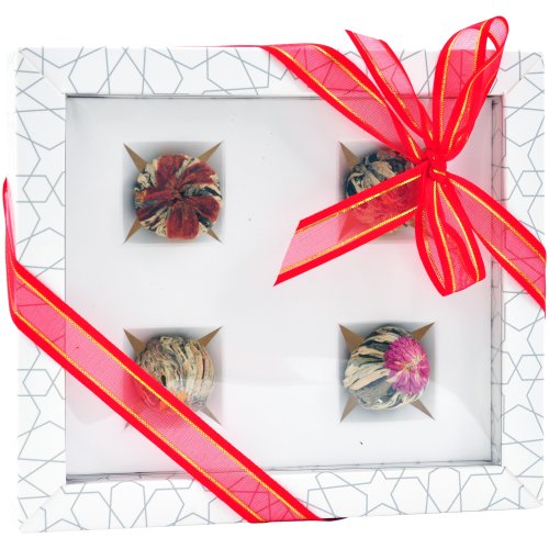 Dekoratívna sada 4 ks kvitnúcich čajov v bielej krabičke s červeno-zlatou mašľou. Perfektný darček v krásnej podobe.
