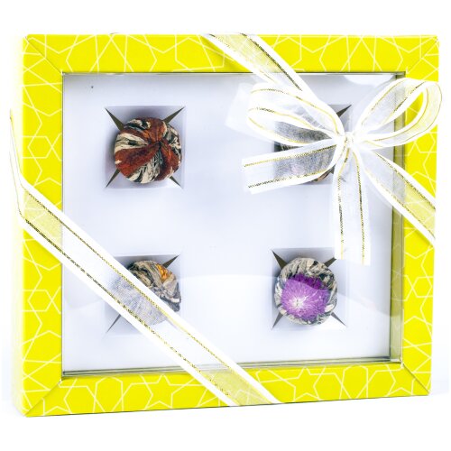 Dekoratívna sada 4 kvitnúcich čajov v limetkovozelenej krabičke s bielo-zlatou mašľou. Perfektný darček v krásnej podobe.